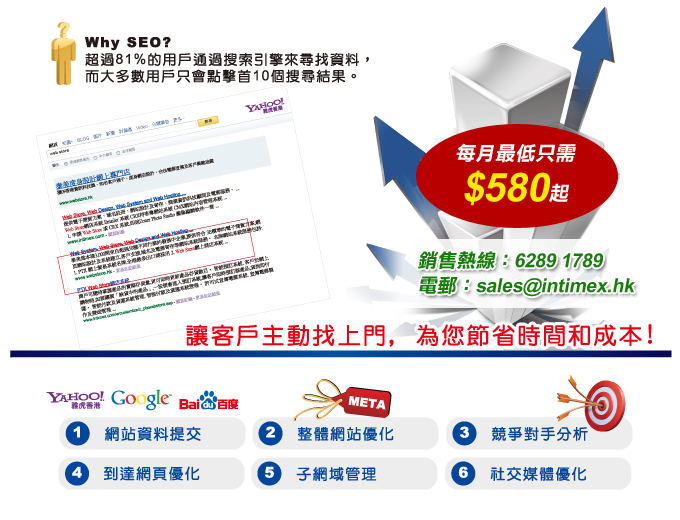 準確的搜尋器優化SEO (Search Engine Optimization) 不單能提高排名,更能建立品牌形象,鞏固市場地位,有利網站的長遠發展。